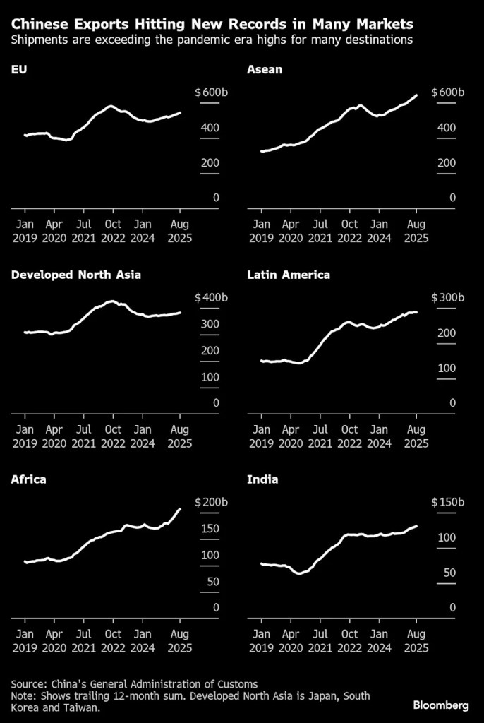 With access to the US curtailed, Chinese manufacturers have shown they aren’t backing down: Indian purchases hit an all-time high in August, shipments to Africa are on track for an annual record and sales to Southeast Asia have exceeded their pandemic-era peak